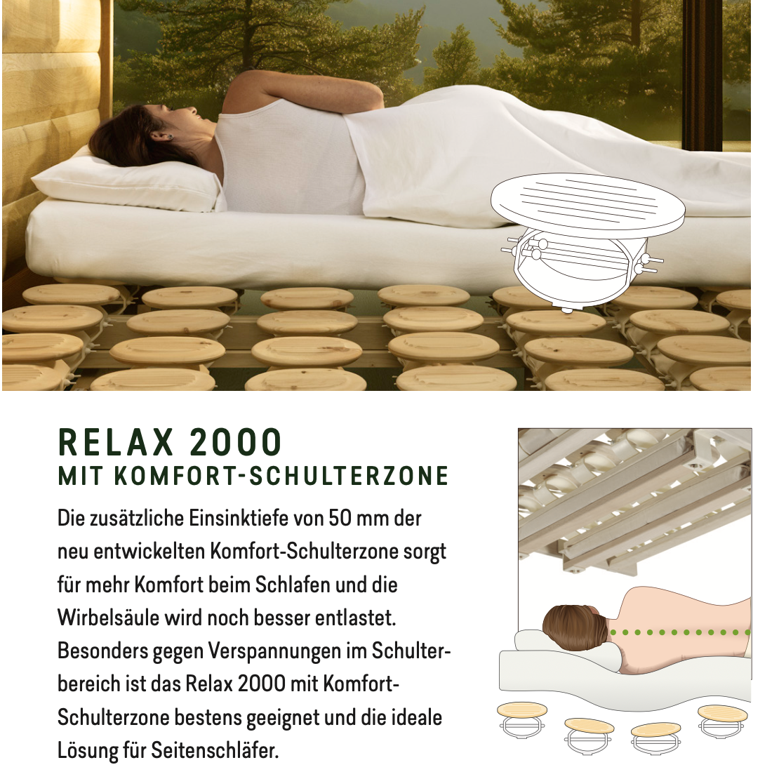 Die Komfort-Schulterzone des Relax 2000 Schlafsystems gewährleistet noch entspannteres Schlafen. Mit einer optimierten Einsinktiefe von zusätzlich 50 mm wird die Wirbelsäule noch besser entlastet und wirkt so nachhaltig gegen Verspannungen im Schulterbereich. Seitenschläfer wissen die Komfort-Schulterzone des Relax 2000 Schlafsystems besonders zu schätzen.